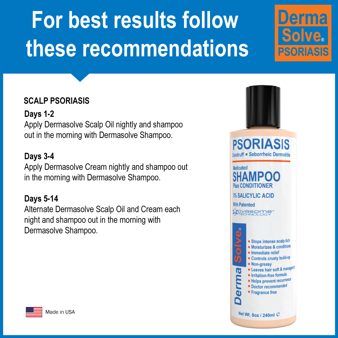 Dermasolve Psoriasis Shampoo is your ultimate solution for combating the discomfort of psoriasis, dandruff, and seborrheic dermatitis. Harnessing the power of the active ingredient salicylic acid and our proprietary Ovasome technology, this advanced shampoo offers targeted relief, helping to restore the health of your scalp and hair. Formulated to be safe on color treated hair.